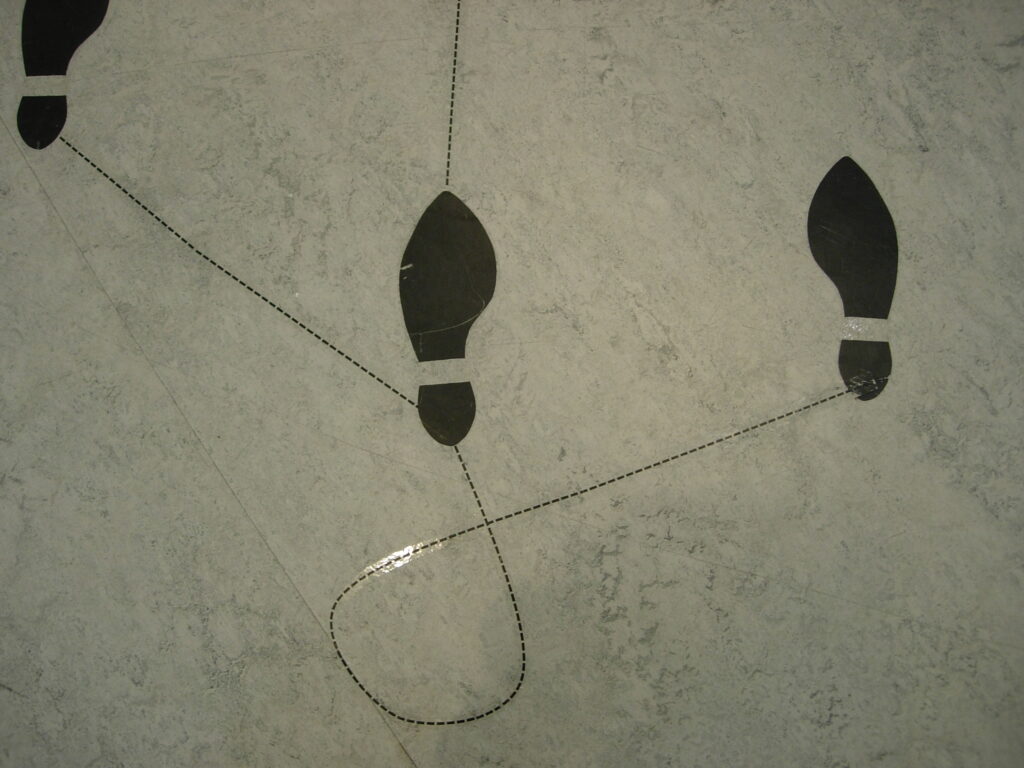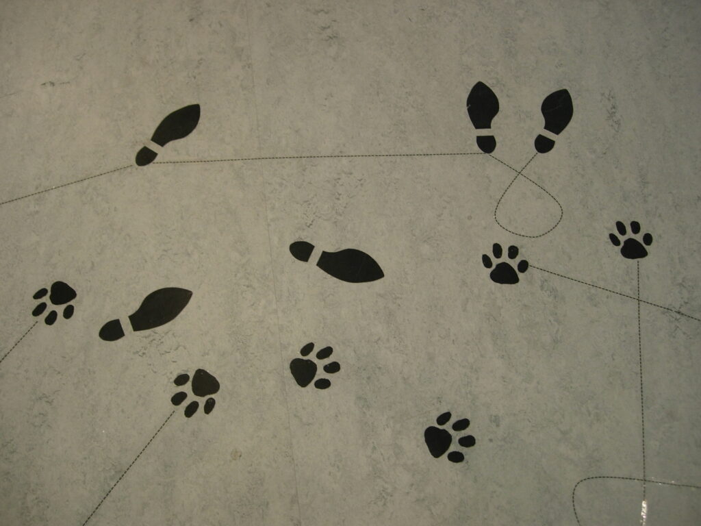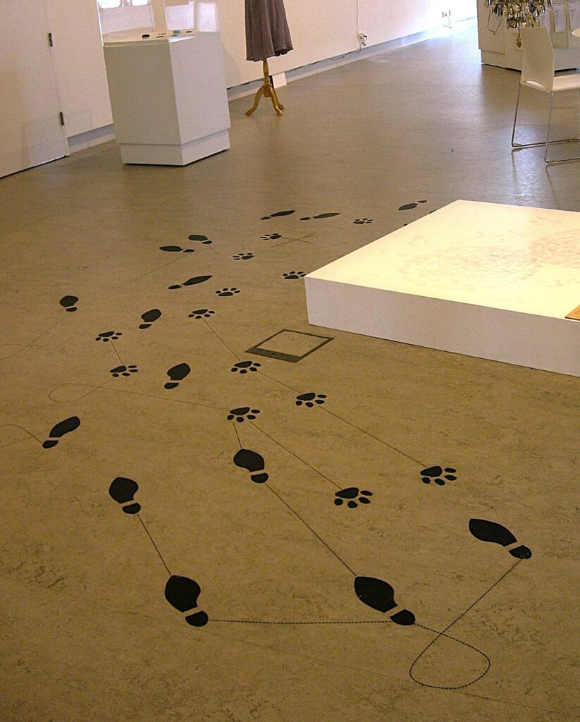Shoe prints and paw prints are scattered across the gallery floor, connected by dotted lines like vintage ballroom instructions. The steps are impossible; no body could follow them, human or otherwise but when you look at it you can hear the music.
